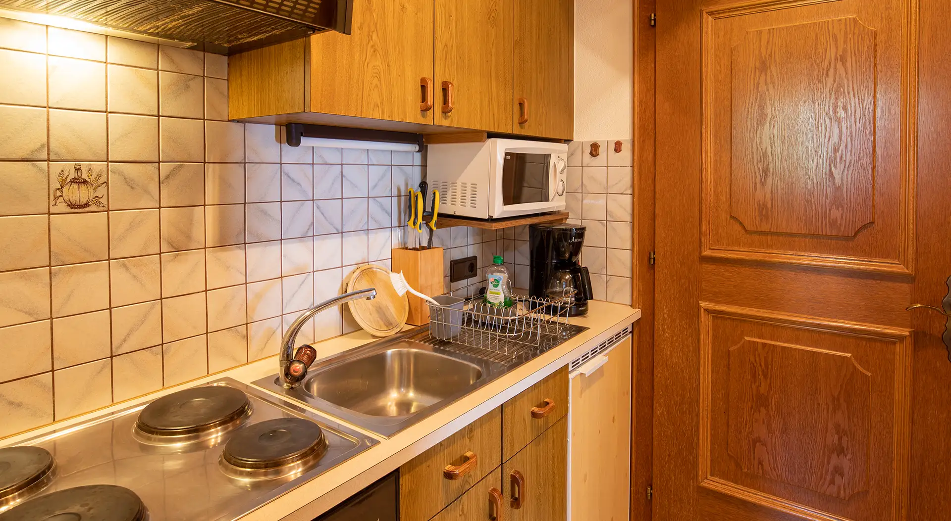 In the spacious common room, you will find a fully equipped kitchen with an electric stove, refrigerator, microwave, dishwasher and coffee machine. Crockery, cutlery and glasses are of course provided in sufficient quantities.